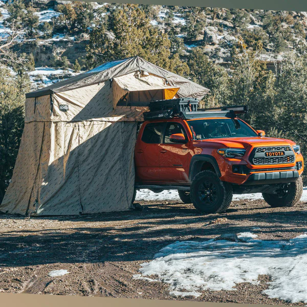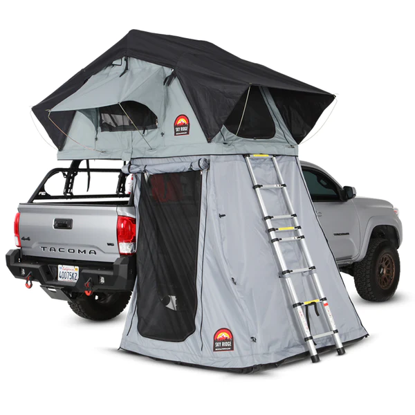 The Mt. Shasta tent is designed for ‘two plus,’ meaning it can comfortably sleep two adults plus a dog or smaller child, especially if you opt for the extended version. It can still easily fit on all trucks, trailers, and SUVs, as well as most cars. An annex adds extra space beneath the tent for changing, cooking, storing gear, or sleeping.